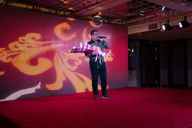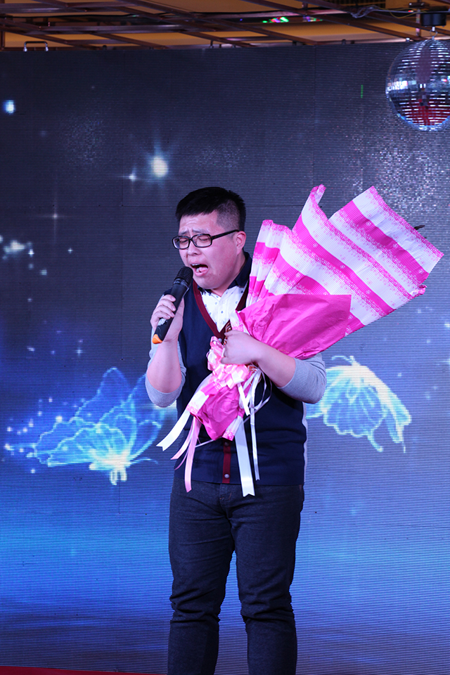 第二環(huán)節(jié)是生產(chǎn)制造部林秋楓的脫口秀《生活真煩惱》,搖身一變知心大姐和我們嘮嘮家長里短生活煩惱,最后一曲《社會搖》結(jié)束了“生活的煩惱”。不得不佩服林姐的好口才??!今年晚會節(jié)目的“亮眼之作”小品《綁匪》,真是讓人眼前一片那啥?。ù颂幨÷圆徽f)。營銷部的賈殿鵬和市場部的王元峰為了節(jié)目也是蠻拼的啦。賈經(jīng)理那一頭金色長發(fā)、和王經(jīng)理那喜慶的肚兜兒,相信大家還是記憶猶新吧!集驚悚、懸疑、搞笑于一身的小品過后,在工程技術(shù)部夏寰宇的一首《你是我的眼》的歌聲中節(jié)目告一段落。之后游戲《看數(shù)字猜成語》、《背連背,心連心》火熱進行。同時由領(lǐng)導抽取幸運二等獎并頒發(fā)獎項。